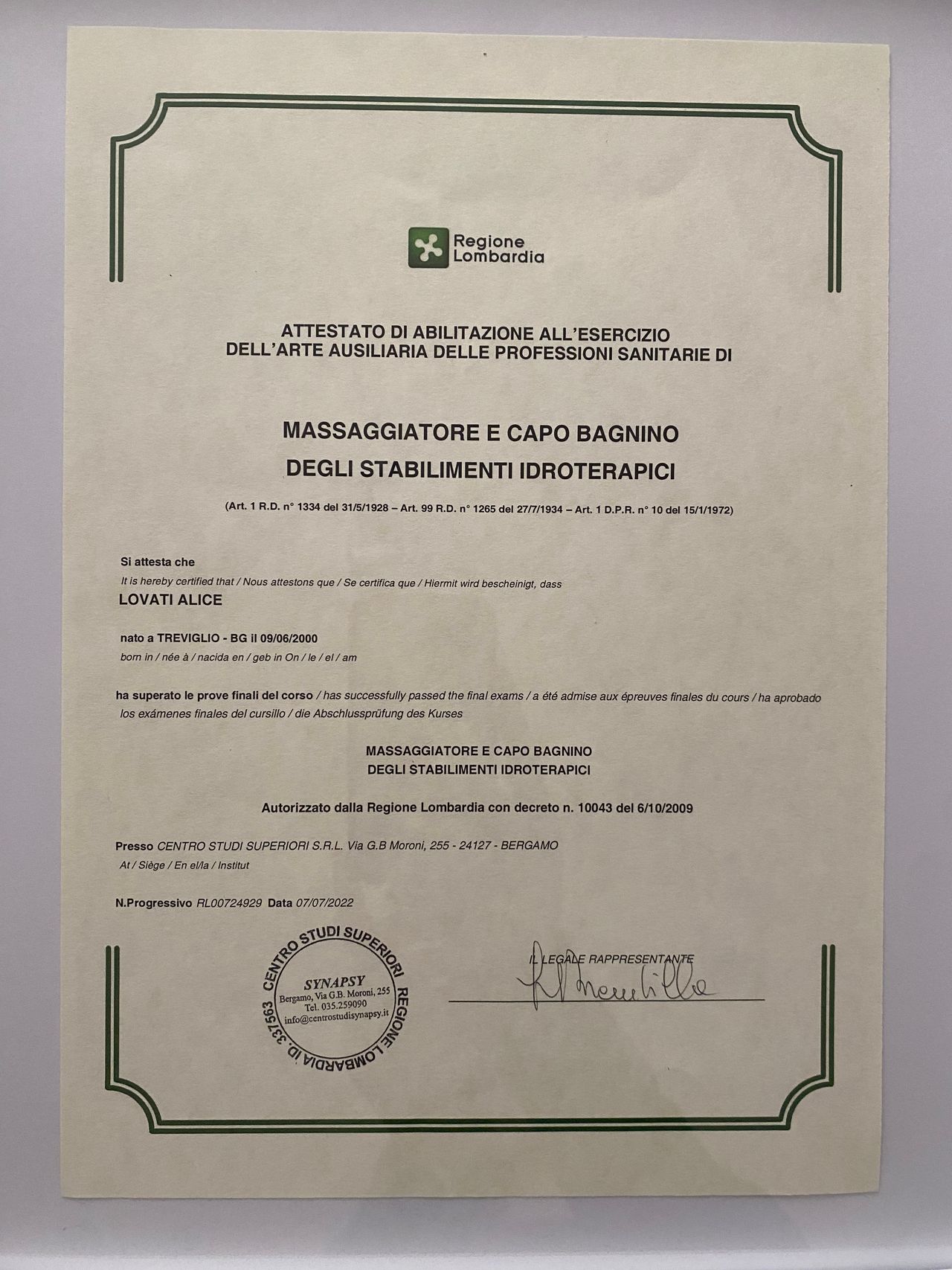 Ho conseguito l'attestato di abilitazione all'esercizio dell'arte ausiliaria delle professioni sanitarie di di Massaggiatore e Capo Bagnino degli Stabilimenti Idroterapici nel luglio 2022.